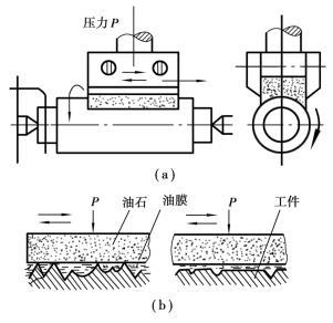 超精加工是用極細磨粒的油石進行光磨的一種光整加工。其加工對象多為軸類零件的外圓,亦可加工滾動軸承溝道及平面等。如圖5.4.3所示,加工時,裝有油石條的磨頭以恒定壓力P輕壓于工件表面。工件以v= 10~15 m/min的速度旋轉(zhuǎn),磨頭以0.1~0.15 mm/s的速度縱向進給,同時作往復(fù)振動,振動頻率為1 000~1 400 s/min,振幅為3~5 mm。磨粒在工件上的運動軌跡應(yīng)縱橫交錯而不重復(fù)。油石條與工件之間要注入潤滑油(一般為煤油加錠子油),以清除屑末并形成油膜。工件表面微觀凸峰首先被磨去,隨著各處凸峰高度的減低,油石與工件的接觸面積逐步加大,單位面積承受壓力隨之減小,當壓力小于油膜表面張力時,油石與工件將被油膜分離,切削作用自行停止超精加工生產(chǎn)率很高。