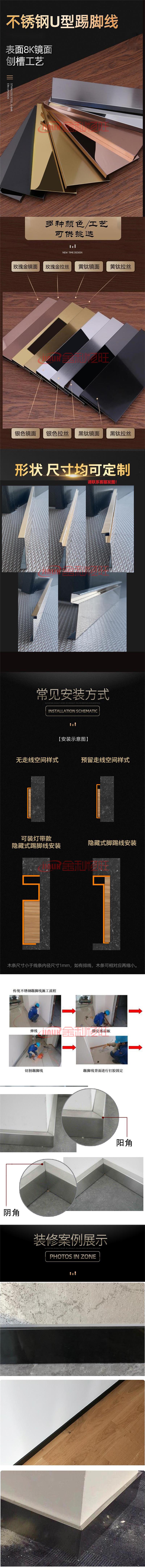 北京批發(fā)201鈦金拉絲不銹鋼踢腳線 2021-05-1516:43:58北京批發(fā)201鈦金拉絲不銹鋼踢腳線已關(guān)閉評(píng)論品名:不銹鋼踢腳線? ??廠家:金利恒不銹鋼材質(zhì):201不銹鋼,304不銹鋼;? ?常用厚度:0.65mm,0.75mm,0.85mm,1.2mm等 ;高度:10cm,8cm,5cm等皆可定制;顏色:白拉絲,黑鈦,灰鈦,鈦金,玫瑰金,香檳金,古銅色等。表面工藝:拉絲,鏡面,噴砂,亂紋 不銹鋼門套踢腳線視頻 贊 1 分享