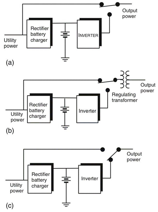 對于在線系統,整流器-逆變器組合在正常運行期間從交流電源提供負載電源。如果主電源出現故障,電池會自動向逆變器提供直流鏈路,并且不涉及時間延遲。如果整流器-逆變器系統出現故障,可以使用轉換開關將負載轉移到交流電源。
