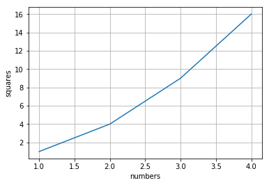 看看上面的代碼行,我們沒有給出一個數(shù)組,而是有兩個列表,它們分別成為我們的X軸和Y軸。這里你可以注意到,如果我們的x軸值是2,它對應(yīng)的y軸值是4,也就是說,y軸值是x軸值的平方。