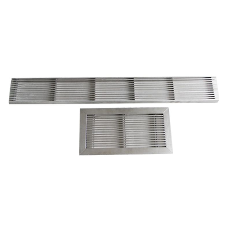 1、不銹鋼長條縫風口,風口由固定葉片組成,葉片沿平行于長邊排列,每節最大連續長度可做成3m,也可把兩節或多節拼起來使用,拼縫處采用插接板連接。該風口氣流流型屬于平面射流,可用于室內送、回風口。送風時,風口上方需設靜壓箱,以確保垂直下送氣流分布均勻。