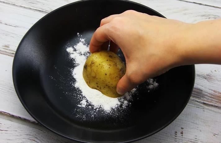- 用小蘇打涂馬鈴薯。將馬鈴薯切面放入一些小蘇打中,用小蘇打輕輕涂在平面上。你可以把一小塊小蘇打倒在盤子上,一邊揉搓馬鈴薯。如果你沒有小蘇打,有人會說普通馬鈴薯會起作用,或者你可以在馬鈴薯上加一點洗碗液。