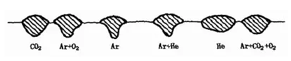 (6)保護氣體成分??氣體保護焊時,保護氣體的成分以及與此密切相關的熔滴過渡形式對焊縫形狀有明顯影響。采用不同保護氣體進行熔化極氣體保護焊直流反接時,焊縫形狀的變化,見圖1—35。射流過渡氬弧焊總是形成明顯蘑菇狀焊縫,氬氣中加入O2、CO2或H2時,可使根部成形展寬,焊縫厚度略有增加。顆粒狀和短路過渡電弧焊則形成的焊縫形狀寬而淺。