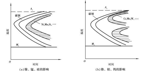 ②提高淬透性 除鈷以外,大多數(shù)合金元素溶入奧氏體后均能增加過冷奧氏體的穩(wěn)定性,使C曲線右移,降低了馬氏體轉(zhuǎn)變的臨界冷卻速度,從而提高鋼的淬透性。提高鋼淬透性的元素主要有鉻、錳、硅、鎳、硼。其中有些合金元素甚至使C曲線的形狀發(fā)生變化,出現(xiàn)了兩個鼻尖,如圖1.5.2所示。