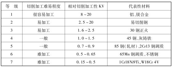 材料的切削加工性能也是選材的重要指標(biāo),一般以相對切削加工性指標(biāo)KV表示,即以45鋼的切削難易程度為1,其他金屬相對于它的切削難易程度的比值確定,見表1.5.20。數(shù)值越大,越易加工。