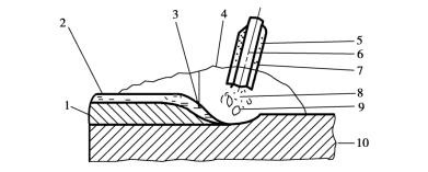 1—已凝固的焊縫金屬 2—熔渣 3—熔化金屬4—焊條藥皮燃燒產生的保護氣體 5,7—焊條藥皮6—焊條芯 8—電弧 9—金屬熔滴 10—母材