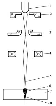 電子束焊接的定義 2019-07-0510:39:01電子束焊接的定義已關(guān)閉評論電子束焊接方法(圖4.3.5)屬于高能密度焊接方法。其特點(diǎn)是焊接時(shí)的能量密度大,可以焊出寬度小、深度大的焊縫,熱影響區(qū)以及焊接變形很小。電子束焊在真空中進(jìn)行,焊縫受到充分保護(hù),能保證焊縫金屬的高純度。電子束焊以前多用于航空航天、核工業(yè)等部門,焊接活性材料及難熔材料。現(xiàn)已應(yīng)用在汽車制造、工具制造等工業(yè),如焊接汽車大梁及雙金屬鋸條等。圖4.3.5 電子束焊原理1—陰極 2—控制板 3—陽極4—電磁透鏡 5—電子束6—聚焦束 7—工件 8—焊縫 贊 0 分享