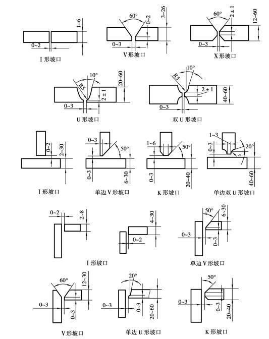 手工電弧焊板厚在6 mm以下對接時,一般可不開坡口直接焊成。板厚較大時,為了保證焊透,接頭處應根據工件厚度預制各種坡口,坡口角度和裝配尺寸可按標準選用。厚度相同的工件常有幾種坡口形式可供選擇,V形、U形坡口只需一面焊,可焊到性較好,但焊厚角變形較大,焊條的消耗量也大些。X形和雙面U形坡口兩面施焊,受熱均勻,變形較小,焊條消耗量較少,但必須兩面都可焊到,所以有時受到結構形狀限制。U形和雙面U形坡口根部較寬,允許焊條深入與運條,容易焊透,而且焊條消耗量也較小;但因坡口形狀復雜,需用機械加工準備坡口,成本較高,一般只在重要的受動載的厚板結構中采用。