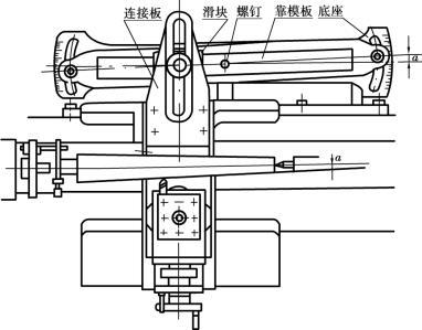 如圖5.2.12所示,靠模法車圓錐面的原理和方法與車成形面相同。只需要把圖5.2.10中的滾柱換成滑塊、曲線靠模板換成錐度靠模板即可。此法加工的表面粗糙度R a值與車外圓相同。