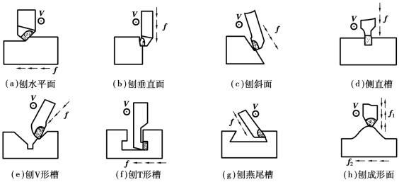 平面刨削方法在實(shí)習(xí)中已學(xué)習(xí)過(guò),這里僅介紹V形槽和燕尾槽的刨削方法。V形槽和燕尾槽是機(jī)器零件上較常見(jiàn)的兩種槽形,它們多用做導(dǎo)軌配合面。