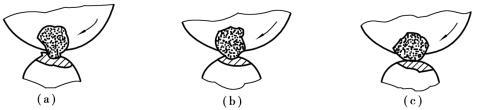 磨削是用分布在砂輪表面上為數(shù)甚多的磨粒進行切削的。磨粒的幾何形狀差異很大,排列很不規(guī)則,間距和高低隨機分布,具有很大的負(fù)前角,棱尖有微小圓弧。如圖5.2.68所示,比較凸出和鋒利的磨粒,能起切削作用,如圖5.2.68(a)所示。凸起高度較小或較鈍的磨粒只能在工件表面刻畫出細(xì)微的溝紋,工件材料被擠向兩旁而隆起,如圖5.2.68(b)所示。磨鈍或比較凹下的磨粒只在工件表面進行滑擦,如圖5.2.68(c)所示。