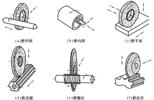 磨削的應用十分廣泛,不但可以磨削內外圓柱面、內外圓錐面、臺肩端面、平面,還可以磨削螺紋、齒形、花鍵等成形面,如圖5.2.71所示。磨削加工精度高,表面質量好,且可加工高硬度材料。