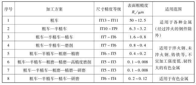 外圓表面是軸、盤套類零件的主要表面之一,其技術(shù)要求一般包括表面粗糙度、尺寸精度以及相應(yīng)的圓度、圓柱度、同軸度等形位精度。常用的外圓加工方法有車削、磨削、研磨和超精加工等。各種精度的外圓表面的加工方案見表5.3.3。